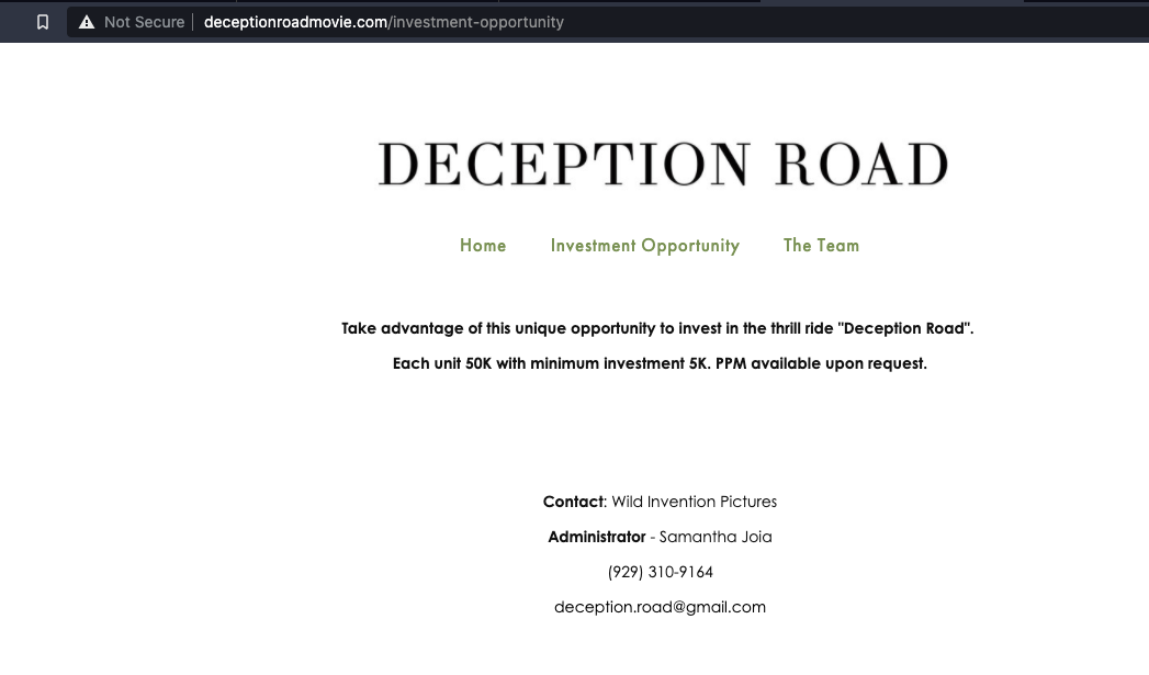 The official movie website for Deception Road was still online and soliciting investors at least through March 2021. It was taken offline in April of 2021, prior content visible here: